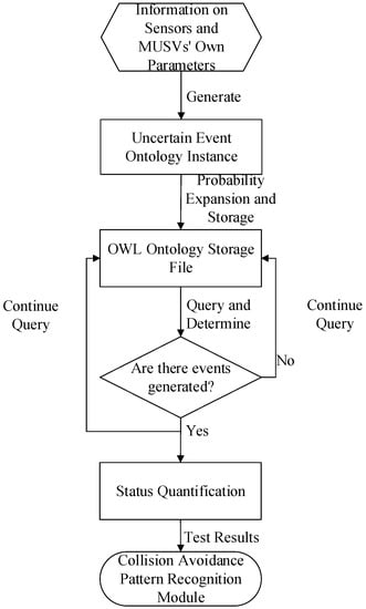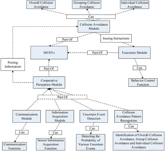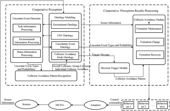 Aiming at the background constraints of MUSVs performing formation safety navigation tasks in the marine environment and the flow characteristics of information during cooperative perception of MUSVs, the proposed architecture of cooperative perception includes []: uncertain event detection module, cooperative collision avoidance pattern recognition module, and environmental ontology model, as shown in Figure 1.