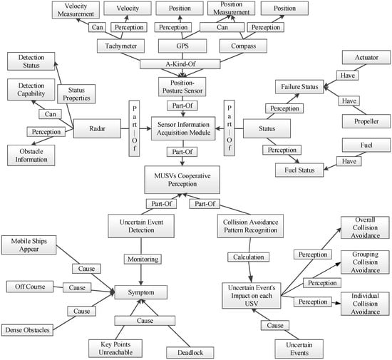 The semantic knowledge framework of the cooperative perception application ontology builds semantic relationships among the nodes around the “MUSVs cooperative perception” node. The sensor information acquisition module, uncertainty event detection, and collision avoidance pattern recognition module are linked to the MUSVs cooperative perception system using Part-Of relationships; the sensor information acquisition is linked to the posture sensor and state awareness using Part-Of relationships; the posture sensor is linked to the tachometer, GPS, and compass using A-Kind-Of semantic relationships. The sensors and functions of MUSVs are attribute relations of Can; information and sensors are perceived and sensed relations. Through the ontological semantic knowledge framework, the information obtained by each sensor of MUSVs stimulates the cooperative perception process, and the cooperative perception motivates the decision and execution modules by establishing semantic relationships with MUSVs, which in turn enables reasoning capabilities similar to those of human minds.