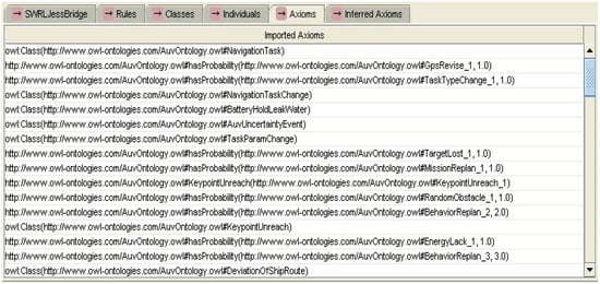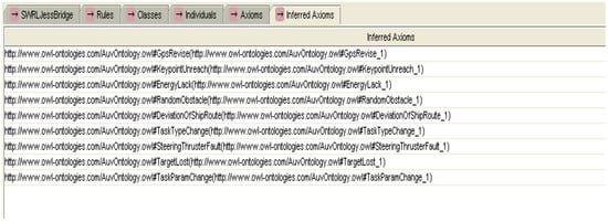 In the cooperative perception process of MUSVs, if the various types of sensor information satisfy the SWRL rules for uncertain event detection, then the occurrence of uncertain events can be inferred from the specified axioms and rules. Figure 5 shows some of the experimental axioms for uncertain event detection inference based on SWRL rules. Figure 6 shows the experimental results of partial SWRL axiomatic reasoning in the cooperative perception process of MUSVs. From the experimental results, it can be seen that the SWRL rules for uncertain event detection of MUSVs developed in this paper can achieve effective results.