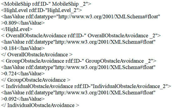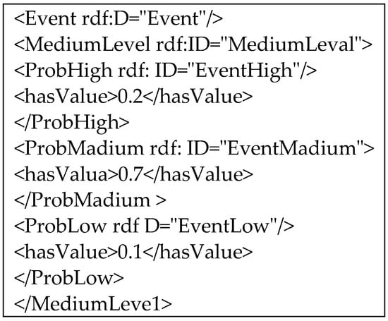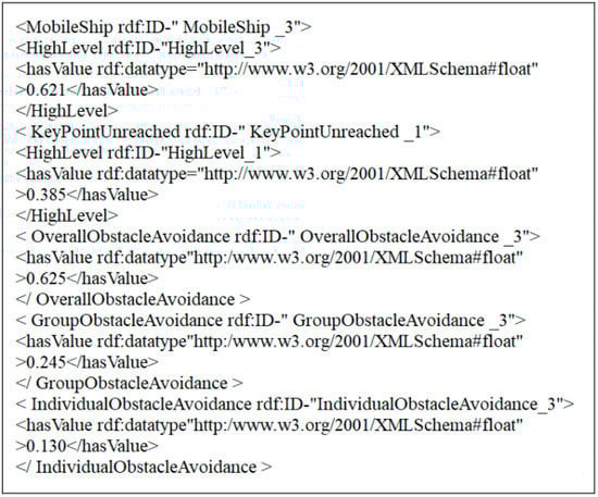 In the process of uncertain event detection in MUSVs, the uncertainty knowledge between uncertain event classes and their attributes can be represented by probabilistic constraint relations, which in turn enables the function of ontology description probabilistic knowledge. Since the language cannot represent the uncertainty of uncertain event classes, this paper implements the probabilistic extension of uncertain event ontologies and collision avoidance ontologies by means of probabilistic extensions to the description language. Data type attributes are introduced; classes are introduced to represent the probabilities of classes and attribute nodes, which contain subclasses (low level probability), (medium level probability) and (high level probability). The above classes and attributes allow a more comprehensive description of the probabilistic knowledge of the cooperative perception process. For example, the instances of the medium rank uncertainty event, with respect to the ontology classes, and, are defined as, and, respectively, initialized with probabilities 0.2, 0.7, and 0.1. In a language with probabilistic extensions, this can be described as Figure 7.
