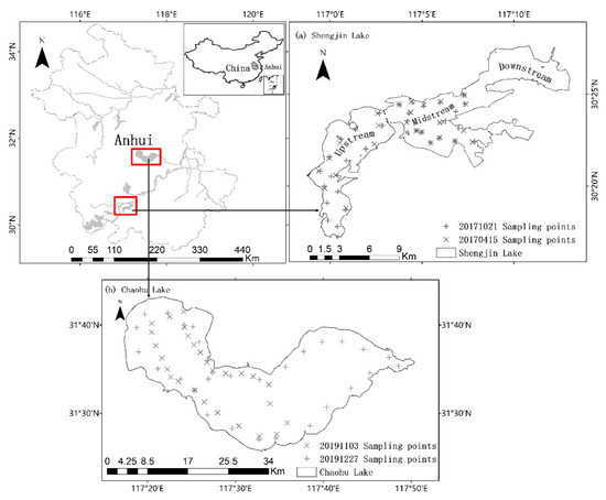 Location of study area and sampling sites. (a) Shengjin Lake, (b) Chaohu Lake.