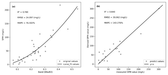 To ensure the transferability of the SPM retrieval model between the OLI and MSI sensors, an SPM retrieval model common for OLI and MSI sensors was developed in Shengjin Lake using the partial least squares method, based on the synchronous field measurement of Rrs and SPM values. Then, the accuracy of the retrieval model was comprehensively evaluated using the three indicators (R2, RMSE, and MAPE) of calibration accuracy and validation accuracy. The results showed that the model with the highest accuracy was the power function model given by y = 610.210 x1.705, where x is B8a/B3 (Figure 3).