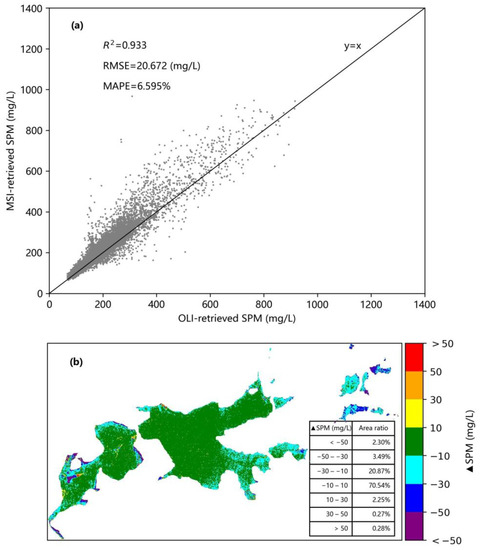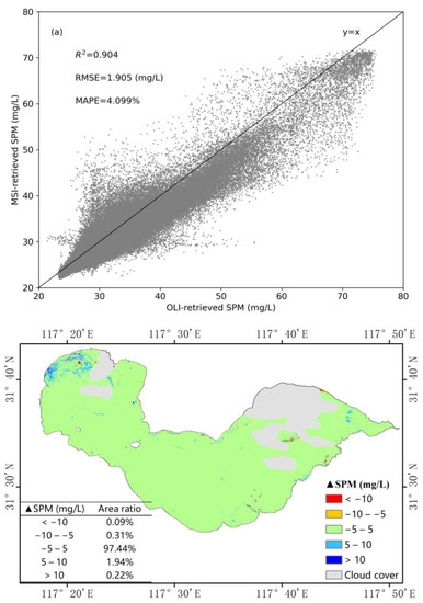 It was found that the SPM values retrieved from OLI and MSI images that were acquired on the same day are highly consistent and distributed around the y = x line. The values of the accuracy measures are R2 = 0.933, RMSE = 20.672 mg/L, and MAPE = 6.595% (Figure 4a). The difference between the values of the SPM concentration retrieved from these two images is between −10 and 10 mg/L over 70.54% of the lake (Figure 4b). In the upstream and downstream parts of Shengjin Lake (which together account for 20.87% of the lake), the SPM concentration retrieved from the MSI image is higher than that retrieved from the OLI image, with the difference being between −30 and −10 mg/L. The difference between the two SPM concentration products is mainly related to the spatial distribution of SPM concentration in Shengjin Lake. Our previous studies have shown that the high SPM values of the lake are mainly concentrated in the whole downstream part and the south of the upstream part [36].