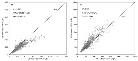 For the OLI and MSI images, the consistency of the SPM concentration values retrieved using the same form of models (R2 = 0.933, RMSE = 20.48 mg/L, MAPE = 6.509%) and using the same model (R2 = 0.933, RMSE = 20.672 mg/L, MAPE = 6.595%) were obviously higher than that achieved by applying the optimal models with different forms (R2 = 0.892, RMSE = 33.576 mg/L, MAPE = 21.832%). The consistency of the SPM concentration retrieved using the retrieval models with the same form was slightly higher than that using the same retrieval model.