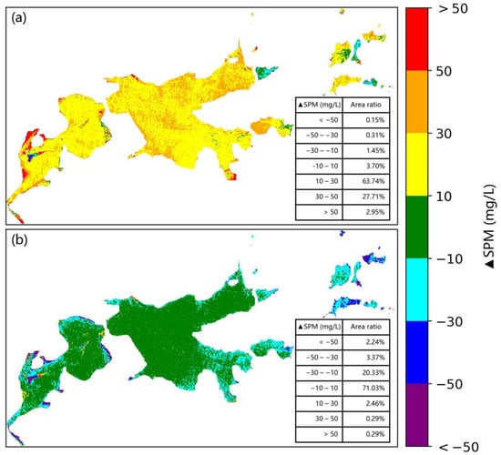 These two SPM retrieval models with different forms were then applied to the MSI and OLI images of Shengjin Lake acquired on 23 November 2019. The consistency between the SPM concentration values retrieved from these two images were R2 = 0.892, RMSE = 33.576 mg/L, and MAPE = 21.832%. This implies that the consistency of the SPM concentration values retrieved from the MSI and OLI images using the two optimal models with different forms was obviously lower than that achieved by applying the same model to the two types of imagery (Figure 6a). In general, it was found that the SPM concentration values retrieved from the OLI image were higher by ~10–50 mg•L−1 than that retrieved from the MSI image. The regions with the SPM different values (ΔSPM) in the range of 10–30 and 30–50 mg•L−1 account for 63.74% and 27.71% of the area of Shengjin lake, respectively (Figure 7a).