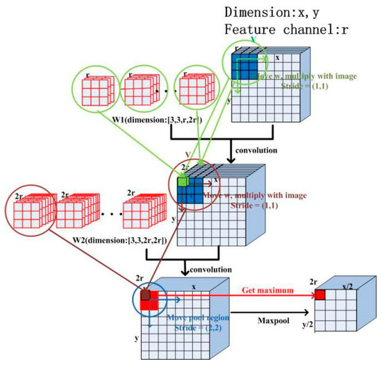 The down-sampling operation is illustrated in Figure 1. As Figure 1 shows, the convolution kernel shifting stride is (1, 1) along two dimensions. This means that the convolution kernels shift 1 pixel along the x and y directions each time and multiple with the image. The convolution consists of a convolution layer and an activation function, and the principle [34] can be described by Formula (1):