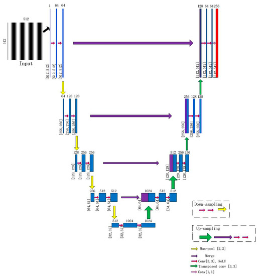 The whole process of network propagation is shown in Figure 3. This process features a contracting path (left), a transition path and an expansive path (right). The size of the input fringe pattern is pixels. After once down-sampling operation, the size of the image is changed to pixels and the number of feature channels to 64. By repeating this process four times, the size of the image is reduced to pixels and the number of feature channel changes to 512.