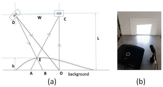 The optical path adopted oblique projection and vertical shooting. The digital fringe projector chosen was Vivitek-D5158HD at a resolution of pixels. The camera used was the Basler ace 1600-20 g, with a resolution of pixels. The optical axis of the projection and the receiving end intersected at point O. Moreover, the camera and the digital fringe projector were at the same height L. Due to modulation by the object’s height, light that was supposed to obtain at point B was cast on point E, but the light point recorded by the camera was A. Finally, the height information of the object was recorded in the fringe pattern.