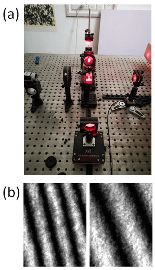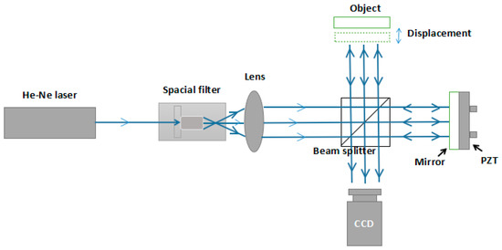 Michelson interferometry is widely used to measure out-of-place displacement. An MI-based measurement system was setup to obtain different interferograms, and Figure 9 shows a schematic drawing of the measurement system. A light beam was emitted from the He–Ne laser generator, and expanded as parallel light beams after going through a spatial filter and convex lens. The parallel light beams were then divided into two identical parts by a beam splitter (BS), and one each was introduced to the reference arm and the objective arm. In the objective arm, the light beam propagated onto the surface of the object and was reflected. The reference arm had a reflector coupled with a PZT used for phase-shifting. Finally, two reflected light beams were returned to the BS and interference onto the surface of a CCD. The phase of the captured interferogram recorded the out-of-place displacement information of the object. By changing the fringe interval or the position of the reflector, 100 interferograms were obtained directly, and the other 900 interferograms were obtained through data extension. Figure 10a,b show physical diagram and some interferograms, respectively.