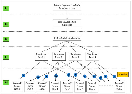 Figure 2 shows the five stages in determining the privacy exposure level of a user. The figure shows the overview of the tree structure that portrays the relationship between privacy (L1), risk in each category of application (L2), risk in a mobile application (L3), permission levels (L4), and data types (L5). The user data size, which is labelled as weight, w, is collected and accessed through the permissions granted, which then leads to the risk quantification for each mobile application. Then, the risk posed by each application is summarized to quantify the exposure of user privacy in an Android smartphone environment. The model is developed to be extended to fit advanced and emerging technologies because there might be new data types and sensors in the future. The development of the model is discussed further in the next step.