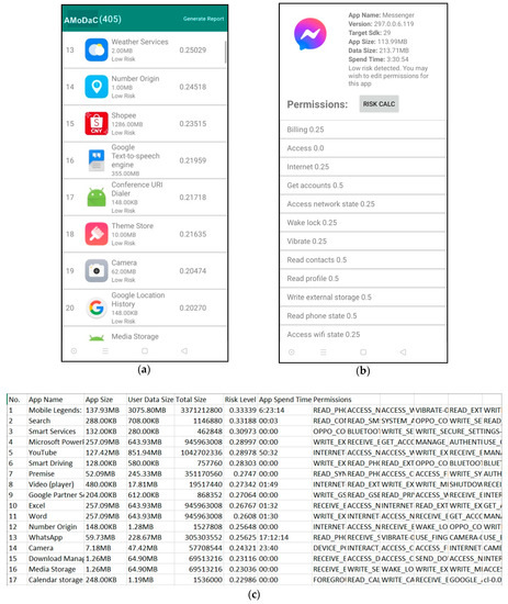 (a) Interface of AMoDaC listing all installed applications and their risk values; (b) Interface of AMoDaC showing additional information on the specific applications; (c) Usage report generated by the user via AMoDaC tool.