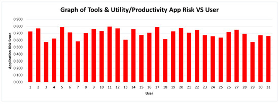 Among the 11 main categories, 10 categories pose low risk, except for Tools & Utility/Productivity. The graph for Tools & Utility/Productivity is presented specifically in this article to show that the risks posed by this category are high and extremely high as compared to others. Based on the scale, the risk level of Tools & Utility/Productivity for some users are between 0.51–0.75, which is considered as High Risk, and some users even exceeded 0.751, which is considered as Extremely High Risk. Besides, the system applications are mostly under the Tools & Utility/Productivity category. Thus, the number of Tools & Utility/Productivity applications installed in Android smartphones, the permission levels requested, user data amount collected, and the total space allocated in storage are high. Previous studies described finance-related apps as extremely risky [24,25,26]. However, this study proved that finance-related apps are not extremely risky because the risk is between 0–0.25, which is low. This result is because this type of application mostly requests a necessary number of permissions and most permissions are only needed for its functionality. This finding is in contrast to Tools & Utility/Productivity apps such as CamScanner, Calendar, Microsoft Office, Notes, etc. These applications request a more dangerous level of permissions, high numbers of permissions, and a high amount of user data.