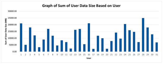 Previous researchers have overlooked the user data attribute. User data size should be embedded in the model because it determines the risk level faced by the device owner. It consists of sensitive and non-sensitive personal data and sensor data that could be used to identify a person. The user data sizes vs. users analysis are important to portray the amount of data collected by the applications in the whole usage of the Android smartphone because the high collection of user data might lead to data leakage and privacy breaches. Figure 7 shows the graph of user data sizes vs. users.