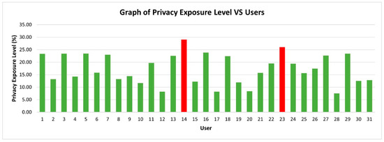Figure 7 shows that the collections of user data are considered high for 26 users because it exceeded 5000 MB worth of data, which might contain highly sensitive data. The user data exposure is very high. The results of privacy exposure level risk vs. user will be discussed further in the next subsection.