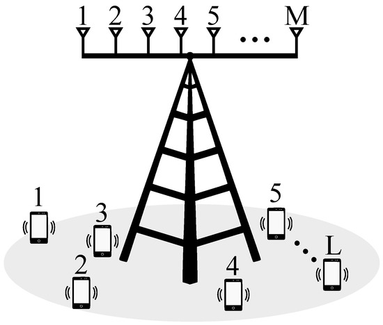 where is the signal-to-noise ratio (SNR), is the instantaneous k-th eigenvalue of the matrix and is the marginal distribution of the eigenvalues. Usually, this model is generally represented by the diagram of Figure 1 with M antennas at the base station and L single-antenna users.