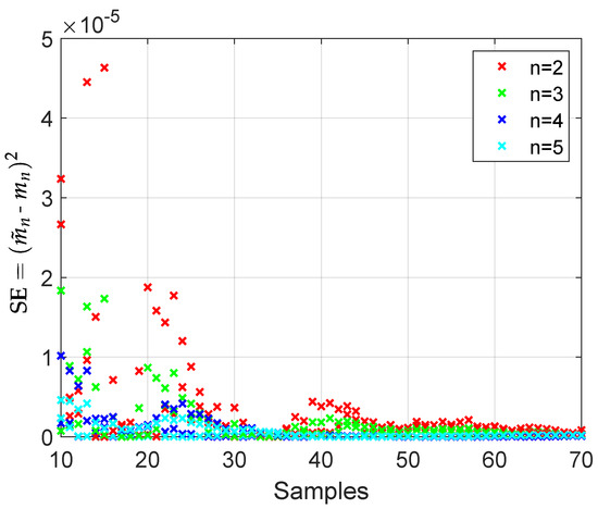 In Section 2.1, this investigation proposed a different Taylor expansion other than (3), considering a Taylor expansion as a power series expansion for about the point . Furthermore, Equations (4) and (7) require the calculation of moments as described in the Section 2.1.1. In order to compute , random phase arguments are generated and used in Equation (11). The calculation of the squared error (SE) is computed as follows.