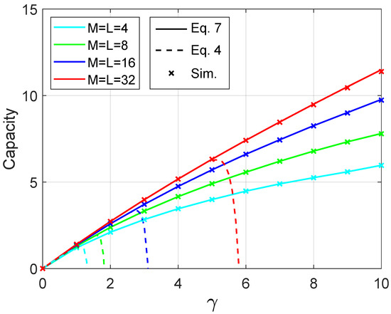 In Section 2, several methods on how to calculate the capacity when is considered as a Vandermonde matrix (with uniformly distributed phases). This section will evaluate the analytical development from the previous subsections using simulations.