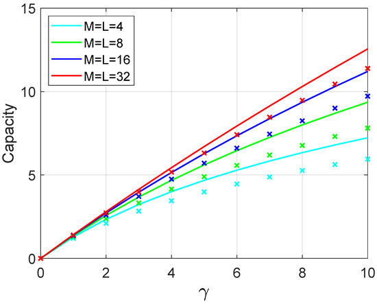 The analytical upper bound, given in Equation (16), is compared against the simulation using the steps for generating a random variable described previously. Figure 4 illustrates the results comparing the simulation and the upper bound approximation. Here, straight lines represent the curve for Equation (16) and the coloured discrete symbol × represents the values yielded by the simulations. As the number of base station antennas and users increases, the gap between the upper bound and simulation decreases.