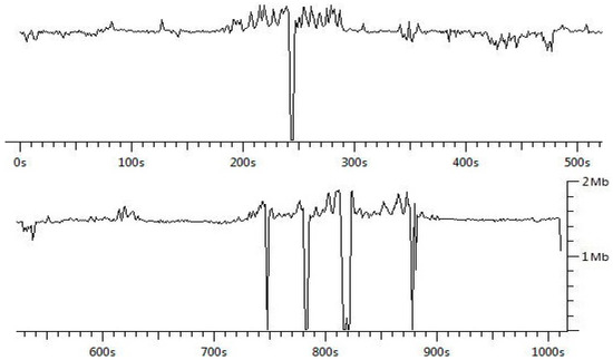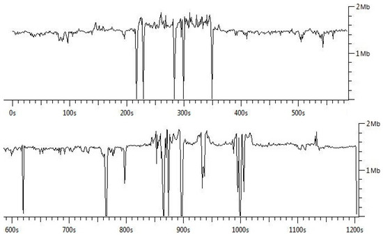 In the second scenario, we conducted the field measurements of vehicular networking using the 5G test network. During the test measurements, the speed was from 0 to 50 km/h (average speed 40 km/h) and the distance between cars was approximately from 5 m to 200 m. As depicted in Figure 5, the connection between vehicles was on almost all the time and the data rate remained quite stable, as in the previous case. The 1202 bytes of data packets were transmitted with a 1 ms transmission delay. The average throughput during the trip was 1.55 Mbps.