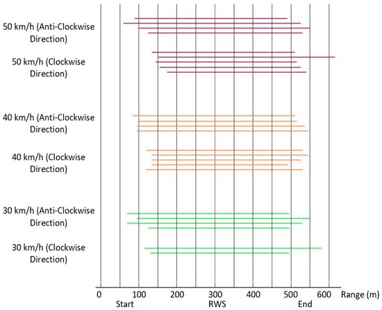 To calculate the range of heterogeneous networking, we used a Python software where the RWS transmits the data to the nearby passing vehicle, as illustrated in Table 1. To calculate the range, we used Equation (5) by considering that the RWSs distributed the up-to-date road weather data to the nearby passing vehicles. The differences between ranges, calculated from the Wireshark measurements, were ±42 m. Figure 6 shows that the connections were established between 220 m and 480 m before the RWS and lost between 380 m and 630 m after the RWS. The lengths of the connections were from 710 m to 930 m for the considered 5GTN and ITS-G5 networks. The ideal situation for the communication link availability time was calculated according to (5), although the availability of a heterogeneous network has a relation between the ideal situation and the real-time field measurements [15,16].