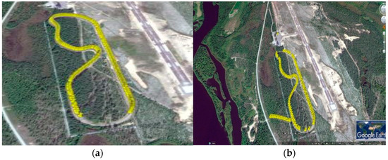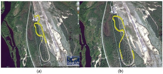In Figure 7a, we can see the UDP packet capture from RWS-1 and in Figure 7b we can see the UDP packet capture RWS-2, respectively. Both RWSs were implemented with ITS-G5 technology. The yellow spots represent the UDP packet capture during field measurements tailored on the test-track. Furthermore, vehicles encountering each other exchanged their latest road weather information received from the RWSs. Figure 7 reveals that there were some points where the connection was lost in V2V and V2I scenarios, and this ultimately affected the average throughput.
