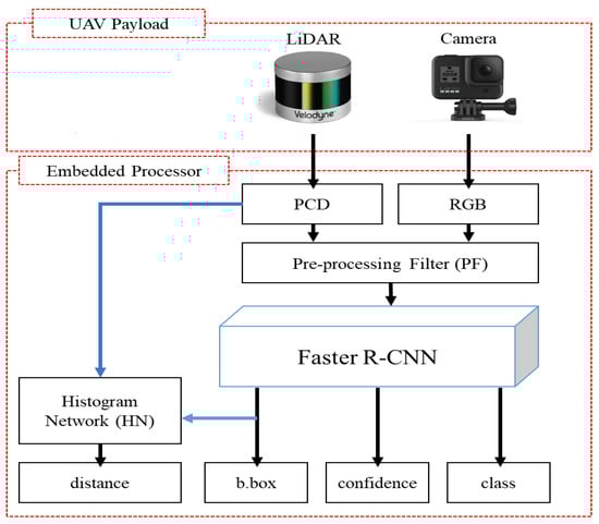 The proposed multimodal data-based detection architecture, RGDiNet, can detect objects in aerial images in which the shapes and dynamic environment of the objects are constantly changing. A LiDAR and a camera are fixed on a UAV, and it is assumed that both the sensors consider only objects present within 40 m. Moreover, the sensors are synchronized. The pipeline of RGDiNet consists of three tasks: the generation of PCD depth maps and RGB images by the PF, object detection and bounding box prediction by the faster R-CNN, and calculation of the distance between the UAV and an object by the HN. The detection is based on the faster R-CNN utilizing a region proposal network (RPN), and the newly integrated image reconstructed by the PF is input into the faster R-CNN to predict the bounding box containing the entity of interest and its confidence score. Subsequently, the coordinates of the bounding box are projected onto the PCD to calculate the actual position of the detected object. Finally, the PCD within the bounding box are quantified to compute the average distance to this object.
