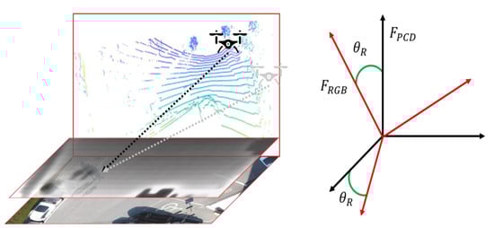 Here, is the 3D vector of the PCD and, using Equation (1), the vector is rotated by an angle about the -axis. Considering a drone flying over the surface of an image plane, as shown in Figure 2, the PCD are created based on the absolute coordinates, . To project them on the image in pixel coordinates, the absolute coordinates, , are rotated by the angle, , to convert into . In this study, the PCD were collected in the direction normal to the ground at a fixed angle of 60° about the y-axis.