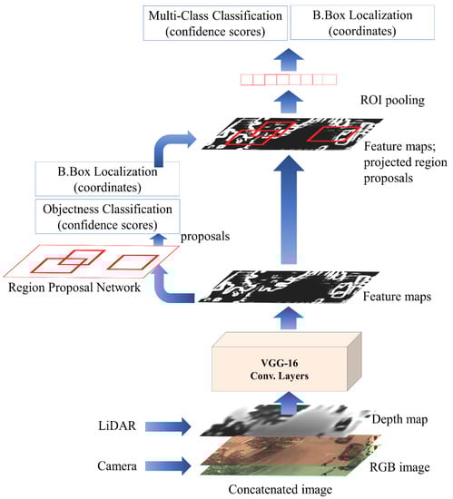 As described earlier, the proposed RGDiNet utilizes a faster R-CNN to detect objects based on a reconstructed RGD image. Figure 3 shows the object detection pipeline using the faster R-CNN. As a backbone architecture for learning image features, a network is built based on VGG-16 [45] and is initialized with pretrained weights using the ImageNet dataset [46]. The core concept of the faster R-CNN is an RPN. While inheriting the existing fast R-CNN structure, the selective search is removed and the region of interest (ROI) is calculated by the RPN. Overall, a feature map is first extracted by the CNN and subsequently sent to the RPN to calculate the region of interest (ROI). The RPN is a fully convolutional network, which effectively generates a wide range of region proposals that are delivered to the detection network. Region proposals are rectangular in shape and may or may not include candidate entities. A detection network is connected after the RPN to refine the proposals, and several ROIs are passed as inputs. A fixed-length feature vector is extracted for each ROI by an ROI pooling layer. The network creates region proposals by sliding a small window on the shared convolutional feature map. In the last convolutional layer, 3 × 3 windows are selected to reduce the dimensionality of the representation, and the features are provided in two 1 × 1 convolutional layers. One of them is for localization and the other is to categorize the box as the background or the foreground [47]. Herein, the faster R-CNN provides the probabilities for the two classes of vehicles and pedestrians viewed from the UAV as well as the coordinates of their bounding boxes. The RPN generates a candidate list of bounding boxes from the RGD aerial image, each associated with a confidence score that measures the memberships of selected parts of an image against a set of object classes versus the background.
