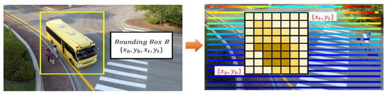 In the proposed RGDiNet, the PCD use a two-point-five-dimensional self-centered occupancy grid map, in which each voxel covers a small ground patch of 0.1 m × 0.1 m. Each cell stores a single value indicating how occupation of the voxel by the object or background. Figure 4 shows a schematic of the estimation of the visual distance to the target. After voxelization, the voxelized PCD are normalized to match the projected points of the bounding box, , and the image coordinate system to the PCD plane. and are the coordinates of the bottom left and top right sides of the bounding box, respectively. Subsequently, the average of the occupation values of the voxels in the projected bounding box is considered as the distance to the target.