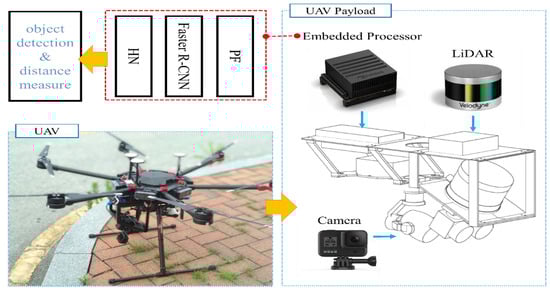 RGB images were acquired by a Gopro Hero 2019 edition camera mounted on a UAV, having a video resolution of 1920 × 1080 and a frame rate of 30 frames per second (FPS). In addition, the PCD were collected by a VLP-16 LiDAR mounted on the UAV; the LiDAR had 16 channels and a frame rate of 10 FPS. A high-performance embedded system module, NVIDIA JETSON Xavier, was installed onboard the UAV for air flight condition monitoring as well as signal processing of the PF, detectors, and HN comprising the proposed RGDiNet. The prototype UAV bus and payload based on NVIDIA JETSON Xavier is shown in Figure 5.