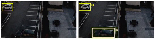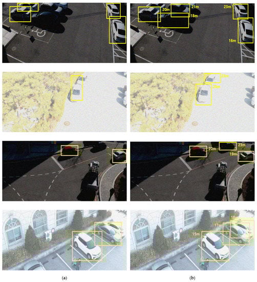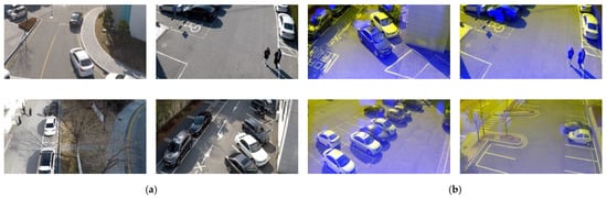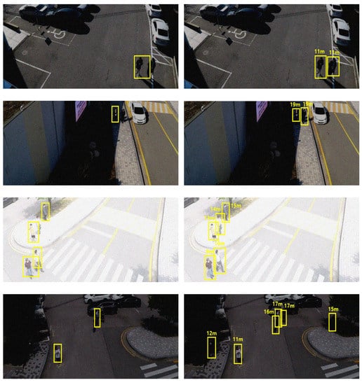 The SCHF dataset was prepared to train the proposed RGDiNet and conduct its performance evaluation. The following three main aspects were ensured when collecting the data: (1) fixed sensor angle of 60°; (2) collection of images of objects of various scales and aspect ratios from 15 to 30 m away; and (3) fixed resolution as 1700 × 700 by image calibration. The video shot on the UAV covered ten different parking lots and two-lane roads. For each location, a 10-min-long video was recorded and “PNG” image files were generated at 1-s intervals. The SCHF dataset contains 3428 frames with 5020 object labels for two categories: pedestrians (1638) and vehicles (3382). In addition, two types of RGB images and multimodal images (RGD) were created for comparison with the results of an object detection system utilizing only RGB images. The dataset was split into two sets: 75% for training and 25% for testing. The details of the dataset are summarized in Table 2, and example images are shown in Figure 6.