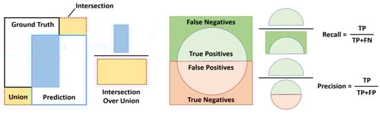 Generally, object detection performance is evaluated to verify the presence of an object image as well as the ability to determine the accurate location of the object in the image [51,52]. Three common indicators were used to assess the detection performance of the proposed RGDiNet: intersection over union (IoU), precision-recall curve (PRC), and AP. For discrete scores, each detection is considered positive if the ratio of the IoU to a one-to-one matched ground-truth annotation is greater than 0.5 or 0.7. By changing the detection score threshold, a set of true positives, true negatives, false positives, and false negatives is created, based on which the PRC and the AP are calculated. Figure 7 depicts the definitions of IoU, precision, and recall.