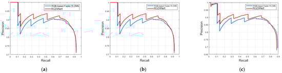 AP comparison of vision-based faster R-CNN and RGDiNet with varying IoUs: (a) IoU = 0.3 (b) IoU = 0.5 (c) IoU = 0.7.