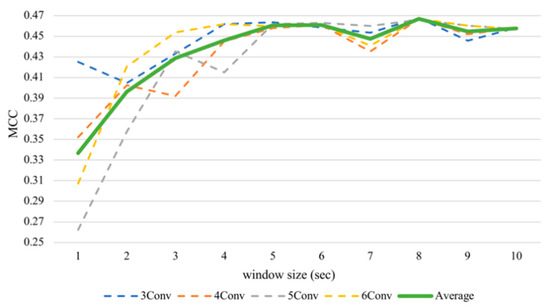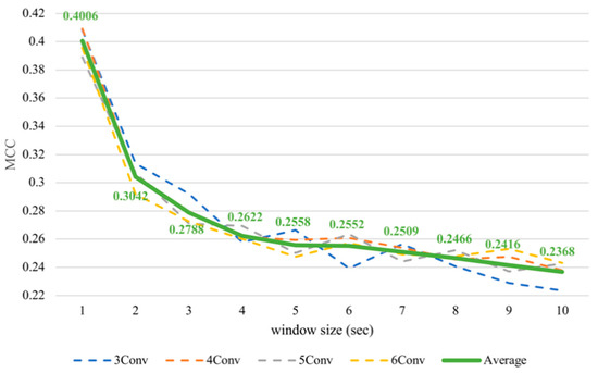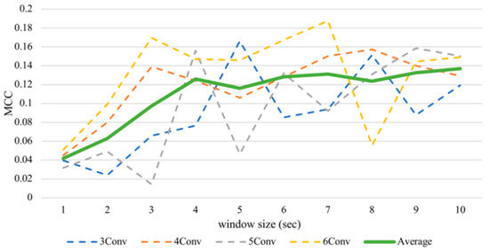 By varying window sizes, we were able to see their effects on the classification performance (Table 3). Increasing the window frame could gain a higher performance in all CNN architectures. In addition, this trend applied to both the arousal and valence. However, this factor seemed to ameliorate the recognition of the valence more than the arousal, considering the valence had an MCC range of 0.1302 while the arousal had a range of 0.0951.