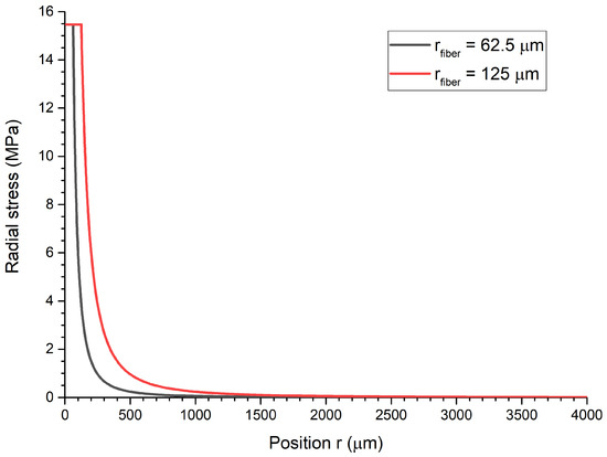 Radial stress as a function of the radial position for fibers with radii a = (grey line) and a = 125 (red line), which are embedded in a cylindrical part made of aluminum during casting.