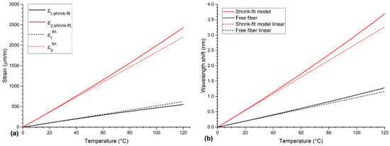 The corresponding wavelength shift of the shrink-fit model is shown in Figure 2b. In addition, the wavelength shift of a free fiber (FBG without any aluminum) is shown as well and shows a lower wavelength shift compared to the shrink-fit model. Again, for reference, the wavelength shifts calculated with temperature-independent parameters (at T = 0 ) are given in Figure 2b as dashed lines.