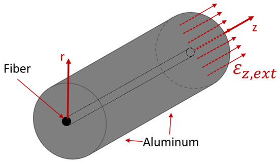 Schematic layout of the embedded fiber in aluminum with applied external axial strain, , acting on both the fiber and the aluminum.