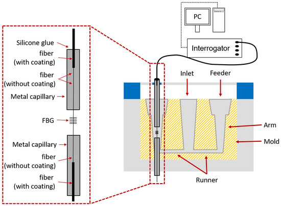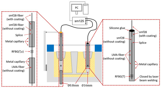 The experimental setup for casting with aluminum alloy (AlSi9Cu3; DIN EN 1706:2010) is illustrated in Figure 10. The geometry of the mold was the same as described above. For fiberoptic temperature measurements, the LMA fiber was cut at 2 mm beneath the RFBG and mounted inside a metal capillary, which had an outside diameter of mm and a length of 30 cm (see right hand side of Figure 10). One end of the metal capillary was sealed by laser beam welding. At the other end of the capillary, the fiber was fixed to the capillary with silicone glue. Due to this loose-tube packaging of the temperature sensor fiber, the RFBG was only influenced by temperature and no strain could be transferred from the aluminum onto this fiber. The second RFBG sensor was in contact with the aluminum and was installed in the other specimen of the cast part, see lefthand side of Figure 10. For ingress and egress of the fiber into and out of the aluminum, two metal capillaries were used to guide the fiber as described above. Both RFBGs were located at the same positions in each specimen of the cast part. Both fibers were connected to the interrogator (sm125, MicronOptics, Atlanta, USA), which in turn was connected to a PC for data recording. To verify that these RFBGs do not show any wavelength drift, the spectra and Bragg wavelengths were recorded during the cast process.