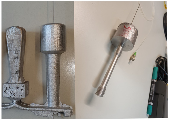 Picture of one arm of a cast part with the embedded FBG strain sensor after casting (left) and after machining (right). The casted part was machined to create a tensile test specimen according to DIN50125 with threaded ends.