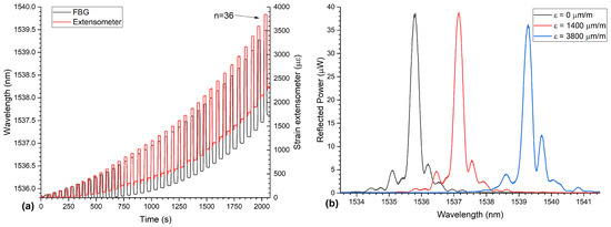 (a) The development of the Bragg-wavelength (here the data from the specimen with the Type-I FBG is shown as an example) and the strain as measured by the extensometer as functions of time during a tensile test experiment. The Bragg wavelengths are shown on the left axis and the strains on the right axis. The force each step was N, with n as the number of the loaded step. After each step, force was reduced to zero again. (b) Spectra of the FBG during tensile tests at different applied strains. The first spectrum (black line) was captured at 0 , the second spectrum (red line) at 1160 , and the last spectrum (blue line) at 2000 .