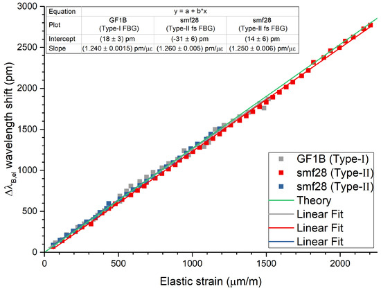 Elastic part of the wavelength shift of each FBG during tensile tests. Linear regressions (solid lines) were applied to the data points (solid squares). The theoretical wavelength shift is plotted as a solid green line as well and shows good agreement with the data.