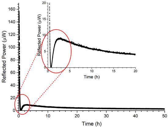 In this experiment, the influence of external temperature changes were monitored with an embedded FBG. To ensure that the FBG itself does not show any temperature-induced wavelength drift during and after the casting, RFBG sensors were used instead of Type-I or Type-II fs FBGs. A total number of two RFBG sensors, one temperature, and one strain & temperature sensor, were manufactured. Large-Mode-Area (LMA) fibers with a cladding diameter of 250 were used because of their increased tensile strength (4 times the cross-sectional area) compared to standard optical fibers (diameter of 125 ). Before inscription of the Bragg seed gratings, the LMA fibers were loaded with hydrogen at 55 bar for two months at room temperature. The coatings of the LMA fibers were removed completely with acetone and standard telecommunication fibers (smf28) were spliced to each piece of LMA fiber. All seed FBGs were inscribed at Bragg wavelengths of ∼1550 nm with a grating length of 3 mm using the same custom in-house UV inscription setup mentioned above. After inscription, each piece of LMA fiber was suspended inside a high-temperature tube furnace with the FBGs positioned in the middle of the furnace. The FBGs were heated up to 900 for 48 . During the first 15 of this high temperature treatment, the seed FBGs transformed into RFBGs. During this time, the reflected power of the FBG decreased followed by a small recovery. This can be seen in Figure 9 with an enlarged view of the first few hours in the inset. The following 33 were used for further annealing the RFBGs, where the reflected power decreased slowly and reached a stable value.
