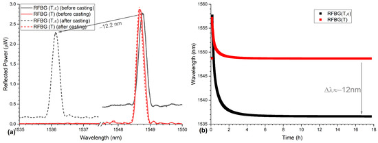 (a) Spectra of the RFBGs before and after casting at room temperature. The spectra of the temperature sensor (RFBG(T)) before (solid red line) and after casting (dashed red line) are superimposed, indicating no drift of the sensor occurred during the casting process. (b) Wavelengths of the RFBGs during the casting of the aluminum. The wavelength of both RFBGs increased at the beginning followed by the cooling of aluminum. The Wavelength of the temperature sensor went back to the starting wavelength and the strain sensor shifted nm towards lower wavelengths due to thermal shrinkage of the aluminum.