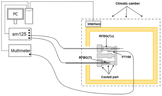 The casted part was installed inside a climatic chamber (VCL4010, Vötsch, Germany). The setup is shown schematically in Figure 12. A calibrated Pt100 temperature sensor was placed next to the cast part to monitor the temperature. For the measurement of the Pt100, a multimeter, and for the RFBGs a sm125 interrogator, were used. Both measurement devices were connected to a computer for data acquisition and the climatic chamber was controlled by a PC via a serial interface.