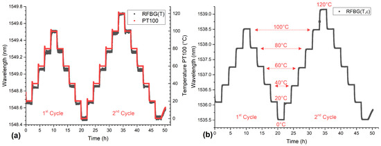 The temperature profile of the thermal treatments consisted of two cycles. The temperature range of the first cycle went from 0 up to 100 and the second cycle from 0 to 120 with a step size of 20 for each cycle. At each temperature step, a dwell time of 2 was chosen so that the cast part and the climatic chamber had sufficient time to reach the thermodynamic equilibrium. During the measurement, the Bragg wavelengths of both RFBG sensors and the temperature of the Pt100 sensor were captured continuously with a measurement rate of 10 Hz. The wavelength of the RFBG temperature sensor and the temperature measured by the Pt100 sensor are shown in Figure 13a as functions of time. The Pt100 sensor followed the temperature of the climatic chamber almost instantly. The embedded RFBG temperature sensor showed a small delay due to the thermal mass of the surrounding aluminum. This can be seen more clearly in Figure 14a, where the wavelength shift from 60 to 80 is shown. The embedded RFBG strain sensor (shown as a blue circle), which was in direct contact with the aluminum, showed the same delay and a larger wavelength shift (about three times) due to the additional thermal strain of the aluminum acting on the fiber. The wavelength of the embedded strain sensor as a function of time can be seen in Figure 13b. The embedded strain sensor showed a total wavelength shift of nm over the whole temperature range compared to the temperature sensor with a wavelength shift of nm.