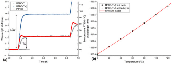 (a) Wavelength shift of both RFBG sensors (left axis) from 60 to 80 and the temperature from the Pt100 sensor (right axis) as a function of time. Both RFBG sensors show a larger delay than the Pt100 sensor and the embedded strain sensor has an about 3 times larger wavelength shift. (b) The wavelength of the embedded RFBG strain sensor (open black squares for the first cycle and crosses for the second cycle) and the theoretical model (red solid line) as functions of temperature. The analytical model agrees well with the measurements.