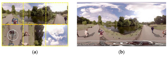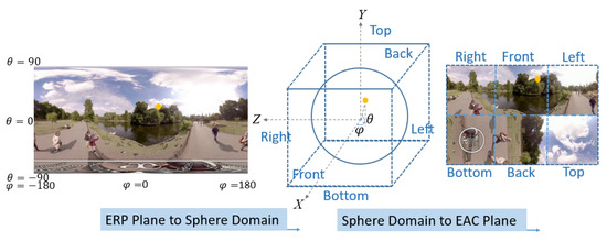 Generally, a 360-degree image is stored as an ERP image after image acquisition and image stitching. To convert an ERP image into an EAC image, two phases are proceeded: ERP plane-to-sphere projection and sphere-to-EAC plane projection [2]. An example of conversion from the ERP format to the EAC format for the 1330th frame of Video #3 (London Park Ducks and Swans) is shown in Figure 2. In the first phase, a sampling point position (i, j) in an ERP image is converted to the position (u, v) in the 2-D projection plane by