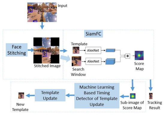 Generally, a 360-degree image is stored as an ERP image after image acquisition and image stitching. However, it can be noticed that videos occupy 80% of internet traffic. Equiangular cubemap (EAC) format is one of variants of CMP format and it has less non-uniform geometric deformation than ERP (Figure 1) [2]. Thus, it enables more efficient video compression than ERP and higher tracking accuracy [22]. Each EAC image has six faces. All angles in the sphere domain have equal pixel counts in EAC format. Problems with tracking in EAC format are stated as follows. First, sphere-to-plane projection may make the target in the real world be projected onto distant regions on an EAC image. Accordingly, content discontinuity of EAC fails most state-of-the-art trackers. Second, to provide immersive viewing experiences, a 360-degree video has a huge amount of data. It is difficult to achieve real-time tracking. Third, non-uniform geometric deformation of EAC format makes the target appearance vary with frame index. Tracking accuracy will decrease if the template is not updated. Few visual trackers have been proposed for 360-degree EAC format videos. Since most handcrafted feature descriptors are not robust against non-uniform geometric deformation in the EAC format, Tai et al. proposed face stitching for the EAC format and a preliminary work of a timing detector of template update for the EAC format by referring to statistics of the score map [23], generated by SiamFC [12]. A total of 1600 local windows of score maps of eight 360-degree videos are analyzed. Analyses of observations indicate that a local window with high mean and low standard deviation implies the higher overlap ratio between the predicted bounding box and the ground truth of the target. However, thresholds of mean and standard deviation of a score map are selected for individual test videos heuristically in Tai et al. [23]. Thus, this paper proposes a Siamese networks-based people tracker using machine learning-based template update for 360-degree EAC format videos. Major contributions of the proposed scheme include: (1) regardless of the content discontinuity, the proposed tracker with face stitching can track a target that moves between any adjacent faces of EAC format. (2) The proposed machine learning-based timing detector of template update is built using a binary Bayes classifier, a statistically optimal classifier [24]. Statistical features and the linear discriminant feature of a score map, generated by the fully convolutional Siamese networks, are extracted and referred to. Statistical features include the mean and standard deviation. The linear discriminant feature is extracted using a dimension reduction Fisher linear discriminant (FLD) algorithm for statistical optimization [25]. The timing detector helps the tracker evaluate tracking accuracy without ground truth. Thus, the tracker can determine whether the template should be updated or not. (3) The proposed tracker operates at 52.9 fps, beyond the frame acquisition rate.