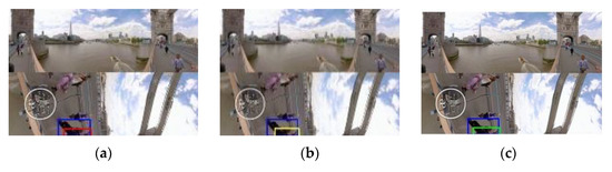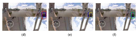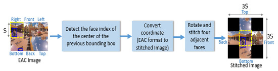 is the 2-D coordinate in the stitched image and is the 2D coordinate in the Nth face of an EAC image. Figure 6 shows conversion for the target located in different faces. In some cases, the center of the predicted bounding box is not located in the central face of the stitched image. It indicates that the target just moved across different faces.