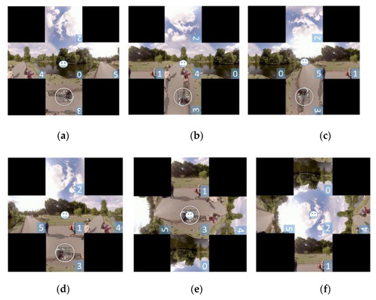 Stitched images that center at individual faces of the 1360th frame of London Park Ducks and Swans [7]. The face containing the smiling face indicates the target location. The orientation of the index number corresponds to the north–south axis in the sphere domain. The indices of central faces in the stitched images are (a) 0, (b) 4, (c) 5, (d) 1, (e) 3, and (f) 2, respectively.
